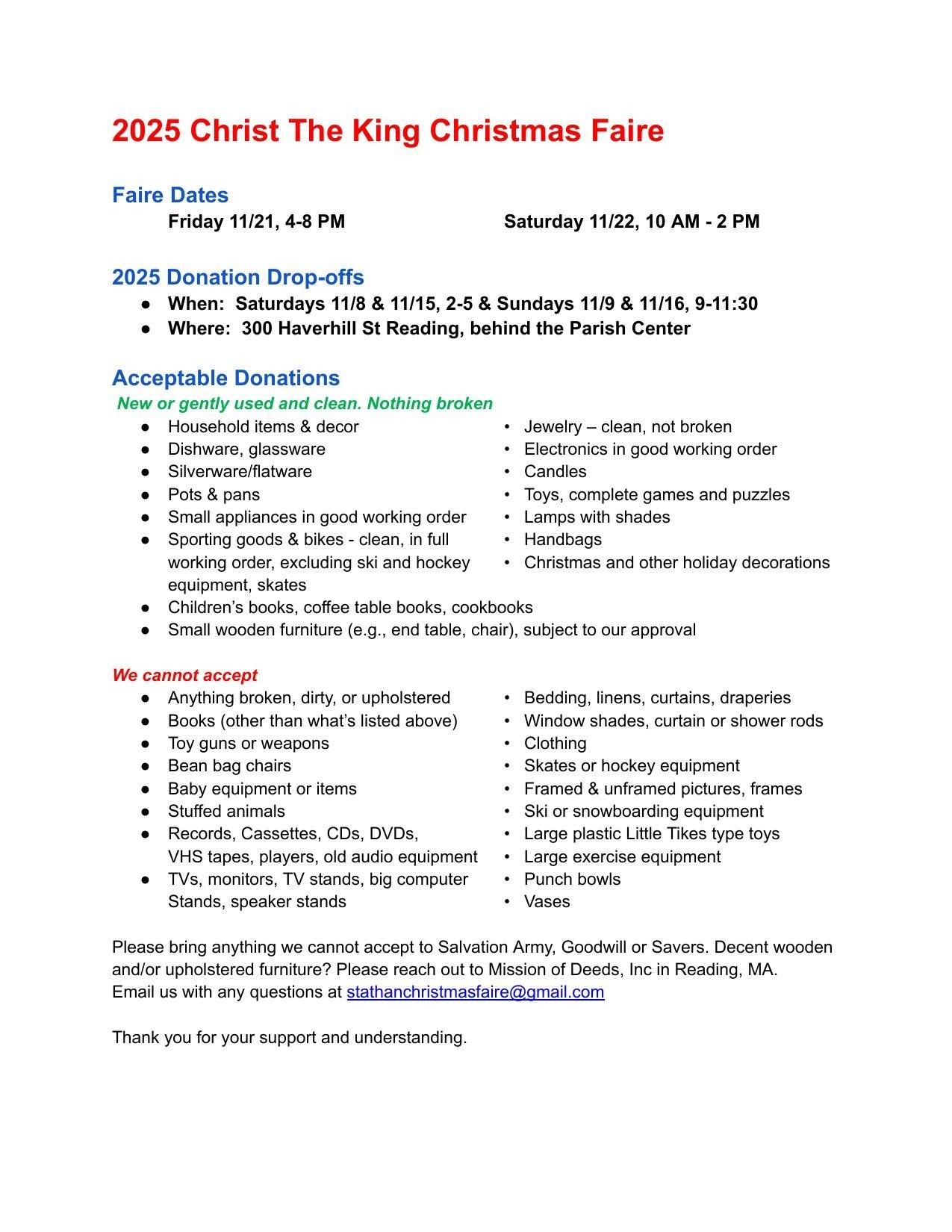 Tuesdays, 6:30pm at St. Athanasius PAC, on November 11| Email us at stathanchristmasfaire@gmail. Student Volunteers can Sign Up Here  | ![]()  |